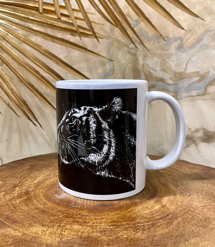 Enjoy coffee in this oversized India tiger black and white souvenir mug. This premium ceramic coffee or milk mug features hand drawn art print of two tiger heads facing each other.